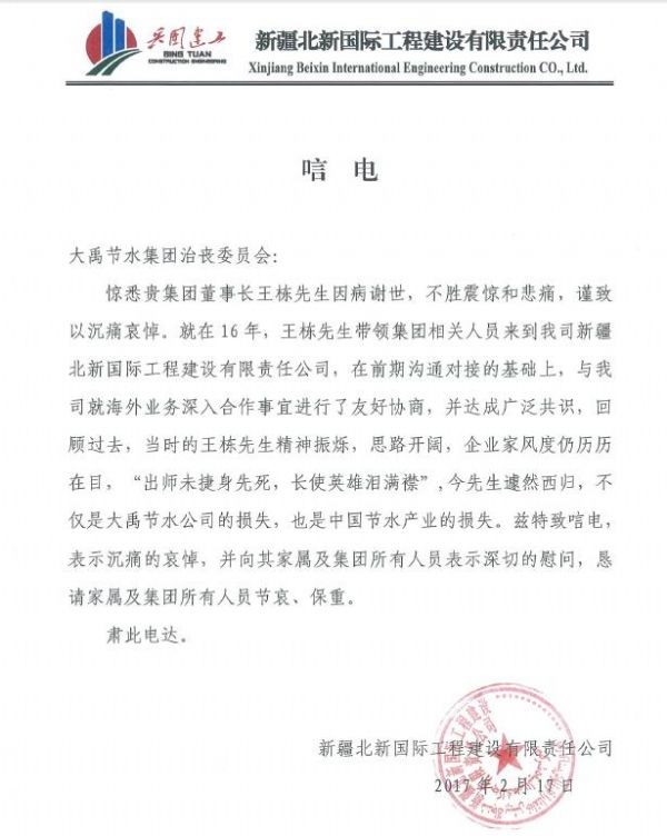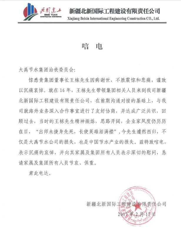 新疆北新國際工程建設(shè)有限責(zé)任公司唁電