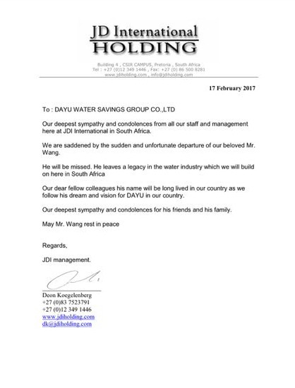 南非JD國際公司唁電