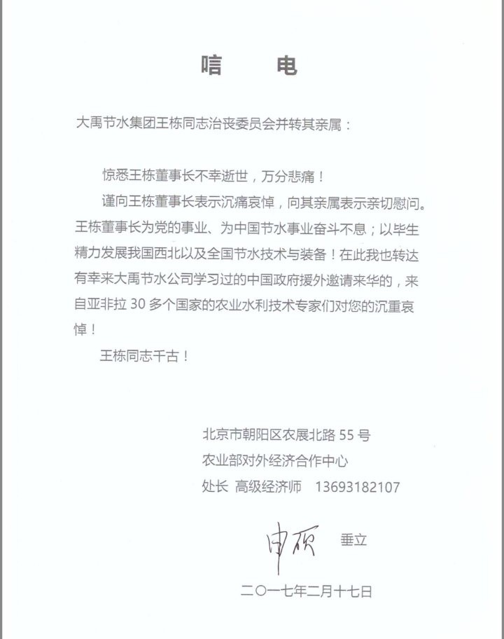 農(nóng)業(yè)部對(duì)外經(jīng)濟(jì)合作中心申碩處長(zhǎng)唁電