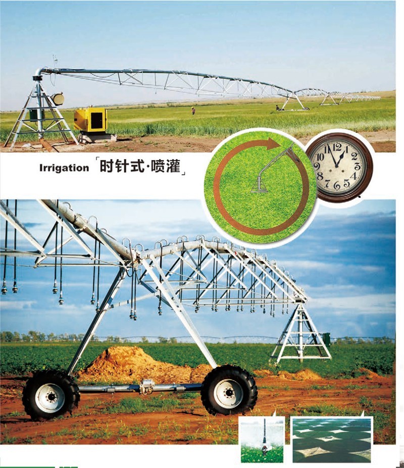 在中心支軸上裝有3個(gè)或4個(gè)輪胎,當(dāng)某一塊地灌溉結(jié)束后,可將噴灌機(jī)拖到另外一塊地上繼續(xù)噴灌,這種設(shè)計(jì)可以實(shí)現(xiàn)一臺(tái)機(jī)器灌溉多處地塊,大大節(jié)約單位面積的投資成本。