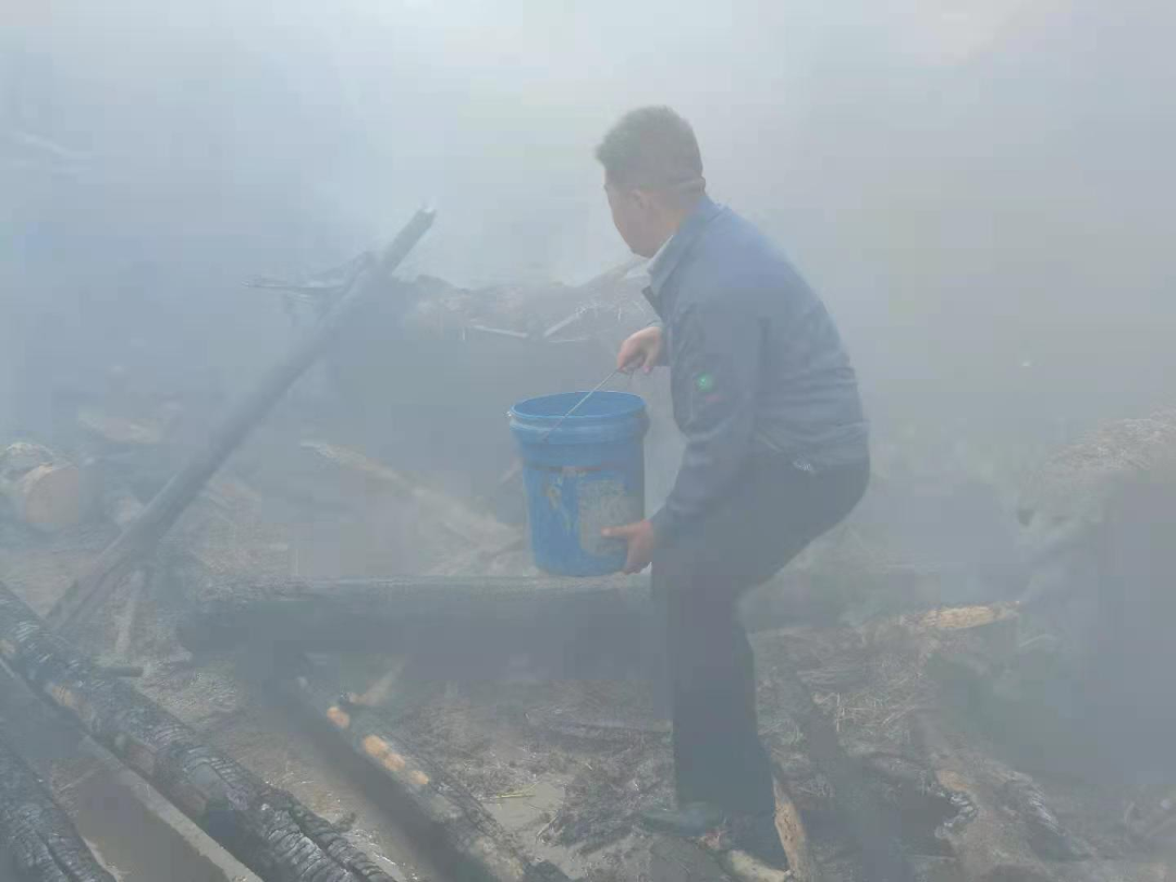 大禹6名員工到達現(xiàn)場后,發(fā)現(xiàn)三家農(nóng)戶的后院草棚已經(jīng)全部起火,濃煙蔓延到整個院落。他們先讓農(nóng)戶切斷了自家電源,然后對明火進行撲救。由于當時風(fēng)速太大,明火撲救效果不明顯,于是他們果斷在外圍做隔離火源處理,拆除附近草棚,防治火勢擴大蔓延。