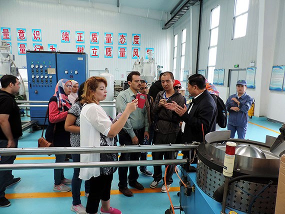 考察團(tuán)一行先后參觀了公司滴灌、PE、PVC生產(chǎn)車間以及公司產(chǎn)品展示區(qū),詳細(xì)了解了公司各類產(chǎn)品生產(chǎn)技術(shù)及實(shí)際運(yùn)用情況。武威公司董事長(zhǎng)王立軍對(duì)考察團(tuán)一行表示熱烈歡迎,并就大禹節(jié)水集團(tuán)公司的發(fā)展歷程及近年來取得的各項(xiàng)成績(jī)向考察團(tuán)一行做了詳細(xì)介紹,重點(diǎn)就滴灌產(chǎn)品及配套設(shè)備設(shè)施的生產(chǎn)工藝、生產(chǎn)流程、產(chǎn)品銷售等情況進(jìn)行了講解。在公司各生產(chǎn)車間,考察團(tuán)一行不時(shí)駐足仔細(xì)觀察和了解節(jié)水灌溉產(chǎn)品生產(chǎn)過程及工藝,并與公司陪同人員親切交流。