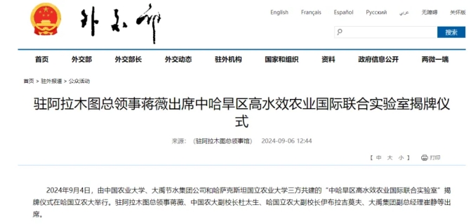 今年7月2日,在兩國元首見證下,中國農(nóng)業(yè)大學(xué)、哈薩克斯坦國立農(nóng)業(yè)大學(xué)和大禹節(jié)水集團三方共建“中哈旱區(qū)高水效農(nóng)業(yè)國際聯(lián)合實驗室”的協(xié)議入選兩國合作清單。
