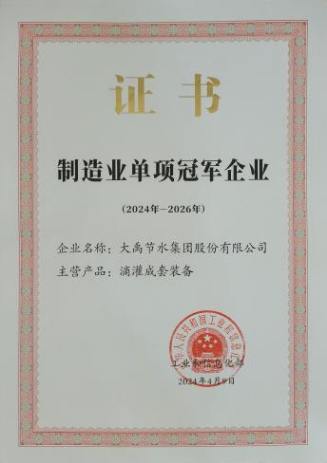 大禹節(jié)水集團憑借卓越的業(yè)績和科研創(chuàng)新能力,榮獲全國第八批制造業(yè)單項冠軍企業(yè)稱號。本次入選的單項冠軍產(chǎn)品是滴灌成套裝備技術產(chǎn)品,此產(chǎn)品打破了國外技術壟斷,實現(xiàn)了國產(chǎn)化替代;祛根防負壓抗堵型滴灌技術,能夠有效緩解農(nóng)業(yè)節(jié)水灌溉灌水均勻性差、易堵塞和運行成本高的難題,帶動了行業(yè)整體水平的提升。