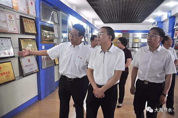 在大禹節(jié)水集團(tuán)公司綜合展廳,李沛興副省長(zhǎng)一行從企業(yè)發(fā)展歷程、基層黨建、榮譽(yù)資質(zhì)等方面對(duì)大禹節(jié)水集團(tuán)進(jìn)行了全面了解,王沖就公司基本情況進(jìn)行了匯報(bào)介紹。在聽到公司黨委被中共中央授予"全國(guó)先進(jìn)基層黨組織"光榮稱號(hào)時(shí),李沛興副省長(zhǎng)對(duì)大禹節(jié)水集團(tuán)高度重視黨建工作,不斷完善基層黨組織體系建設(shè),增強(qiáng)基層黨組織的凝聚力、戰(zhàn)斗力方面取得的成績(jī)給予充分肯定。