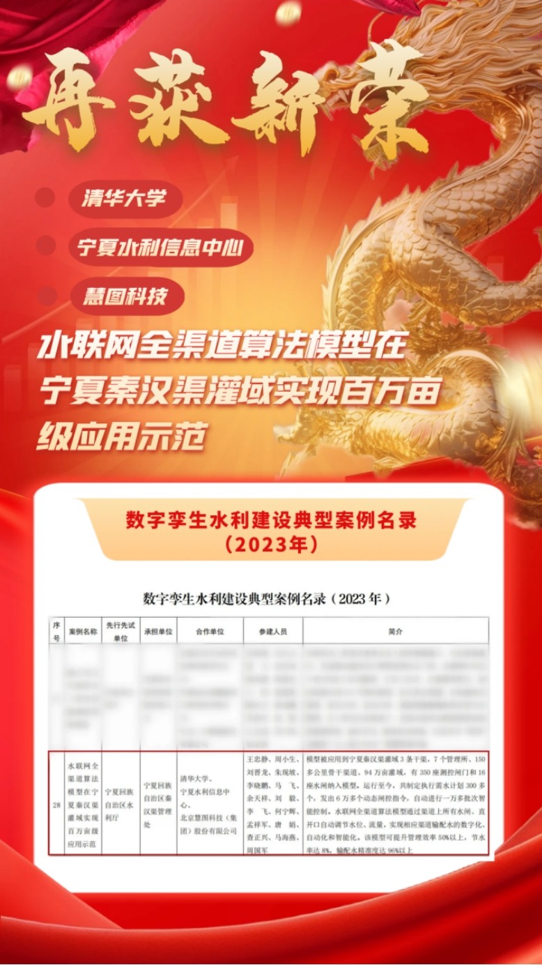 瑞雪兆豐年,龍年好運(yùn)至。日前,水利部發(fā)布“數(shù)字孿生水利建設(shè)典型案例名錄(2023年)公示”,清華大學(xué)、寧夏水利信息中心與大禹慧圖科技集團(tuán)聯(lián)合參建的課題項(xiàng)目“水聯(lián)網(wǎng)全渠道算法模型在寧夏秦漢渠灌域?qū)崿F(xiàn)百萬畝級(jí)應(yīng)用示范”入選水利部數(shù)字孿生水利建設(shè)典型案例名錄,被評(píng)為典型案例。