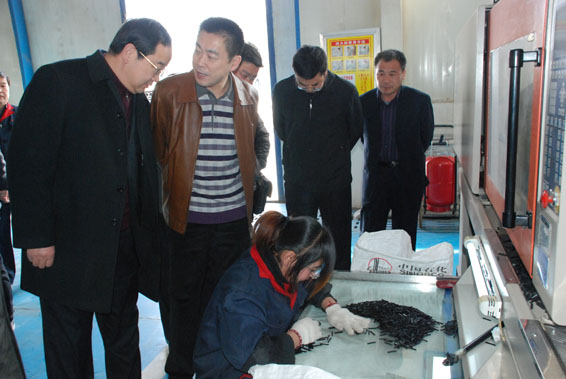 在滴灌車間的滴頭生產(chǎn)機(jī)器旁詹市長向公司董事長王棟了解滴頭的生產(chǎn)加工情況
