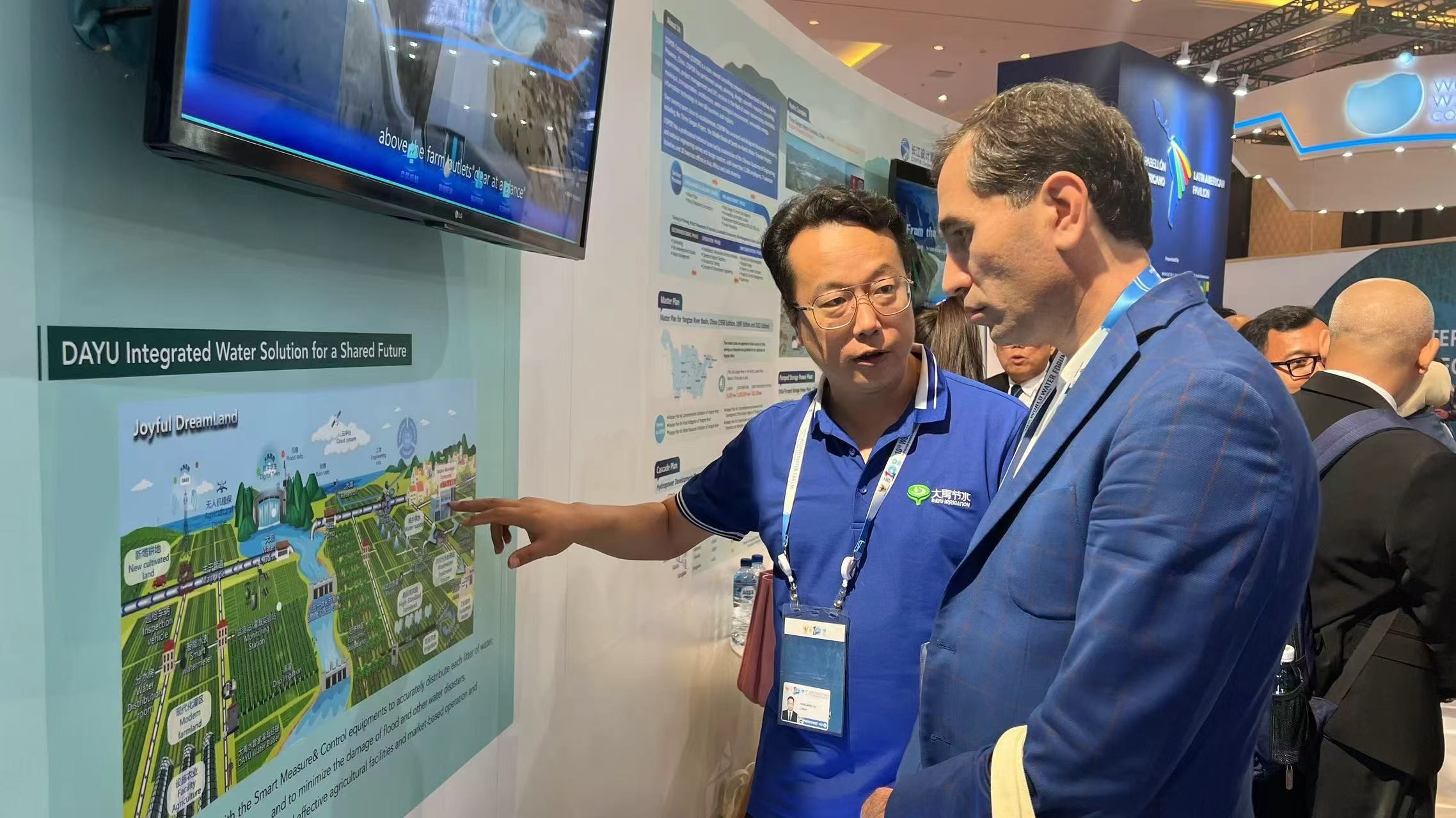 論壇同期舉行了世界水展,中國館位于國家館主館區(qū),集中展現(xiàn)了中國水利工程、技術(shù)等方面的卓越成就。大禹節(jié)水作為行業(yè)龍頭企業(yè),展區(qū)內(nèi)人潮涌動,熱鬧非凡,大禹節(jié)水一體化解決方案成為參觀者駐足的焦點。期間,水利部部長李國英蒞臨大禹節(jié)水展位參觀,聽取集團董事長王浩宇對公司業(yè)務(wù)及項目等情況的匯報。