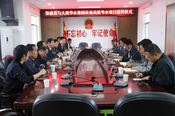 簽字儀式前,雙方在彌渡縣水務(wù)局就合作事宜進(jìn)行了友好會(huì)談。大禹節(jié)水集團(tuán)股份有限公司總裁謝永生向彌渡縣水務(wù)局領(lǐng)導(dǎo)介紹了大禹節(jié)水集團(tuán)的戰(zhàn)略規(guī)劃和業(yè)務(wù)發(fā)展情況,重點(diǎn)介紹了公司在云南農(nóng)田水利建設(shè)及全國(guó)PPP項(xiàng)目等推廣情況,以及大禹節(jié)水集團(tuán)公司在云南省農(nóng)田水利改革中社會(huì)資本參與建設(shè)受到中央、省委領(lǐng)導(dǎo)關(guān)注等情況,希望通過(guò)高效節(jié)水灌溉引入社會(huì)資本投資彌渡縣農(nóng)田水利工程建設(shè),為彌渡縣發(fā)揮反季蔬菜優(yōu)勢(shì)、產(chǎn)業(yè)結(jié)構(gòu)優(yōu)化、農(nóng)民脫貧致富提供水利基礎(chǔ)設(shè)施方面的保障。