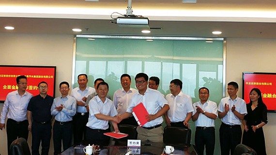▲大禹節(jié)水集團(tuán)公司黨委書(shū)記、副董事長(zhǎng)王沖,董事長(zhǎng)王浩宇與華龍證券股份有限公司黨委書(shū)記、董事長(zhǎng)李曉安