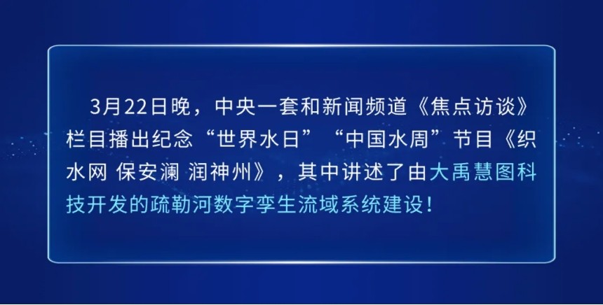 此前,央視新聞頻道以“數(shù)字孿生技術助力134萬畝農田暢飲智慧水"為題對大禹慧圖科技開發(fā)的疏勒河數(shù)字孿生系統(tǒng)進行了報道。