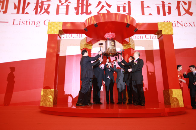 2009年10月30日上午8時30分,上市儀式正式開始,由深交所總經(jīng)理宋麗萍主持,深交所理事長陳東征、央行與證監(jiān)會領(lǐng)導(dǎo)先后致辭。