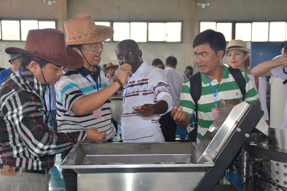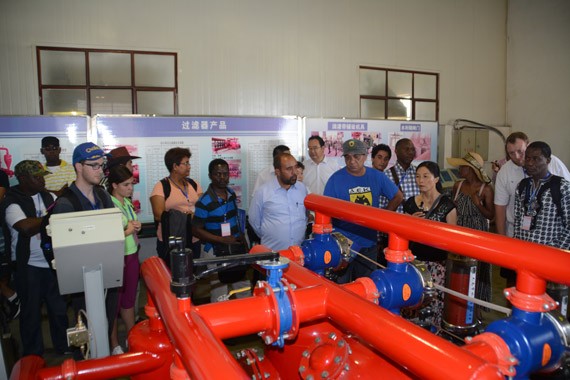大禹節(jié)水集團(tuán)技術(shù)負(fù)責(zé)人正在向"2016年發(fā)展中國(guó)家干旱區(qū)水資源可持續(xù)發(fā)展研修班"學(xué)員介紹公司全自動(dòng)施肥過(guò)濾設(shè)備