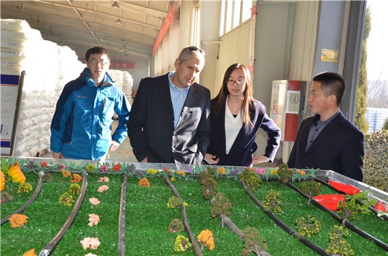 以色列美滋公司亞洲區(qū)市場經(jīng)理Tzur Harel先生在滴灌管(帶)車間參觀滴灌實驗系統(tǒng)