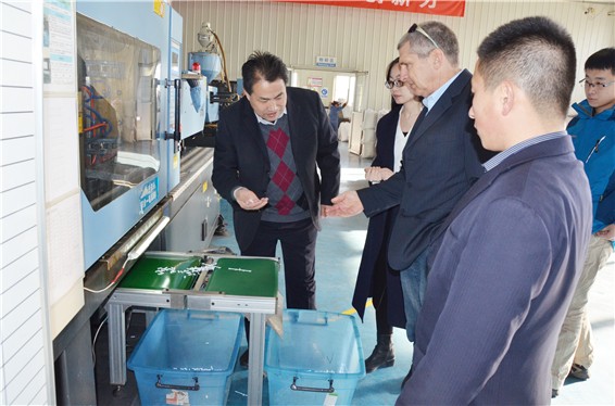 大禹節(jié)水(天津)有限公司常務(wù)副總經(jīng)理潘鈺向Tzur Harel先生介紹滴頭的生產(chǎn)工藝
