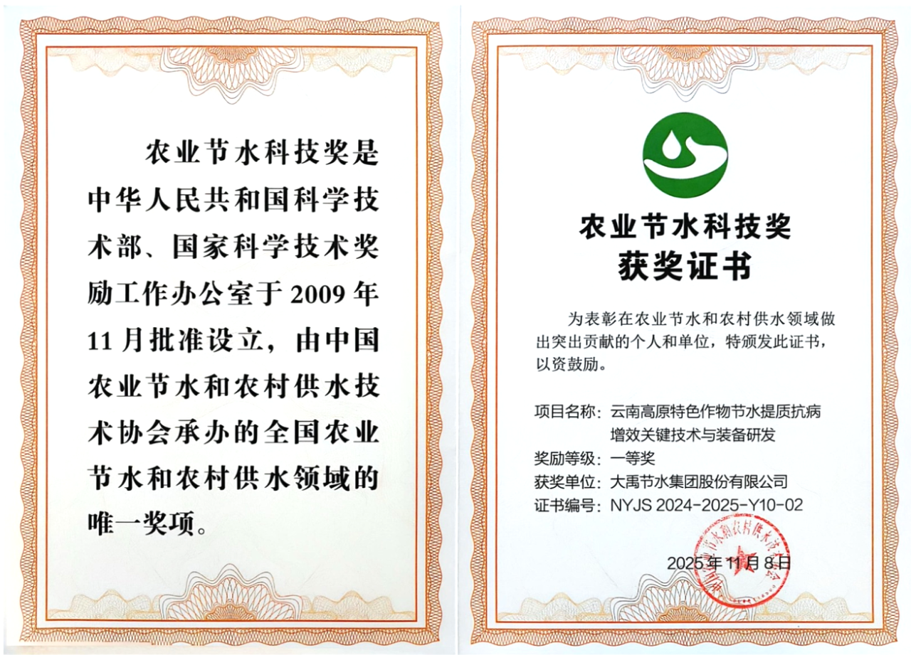 近日,由大禹節(jié)水集團聯合攻關完成的“云南高原特色作物節(jié)水提質抗病增效關鍵技術與裝備研發(fā)”項目榮獲全國農業(yè)節(jié)水科技獎一等獎。