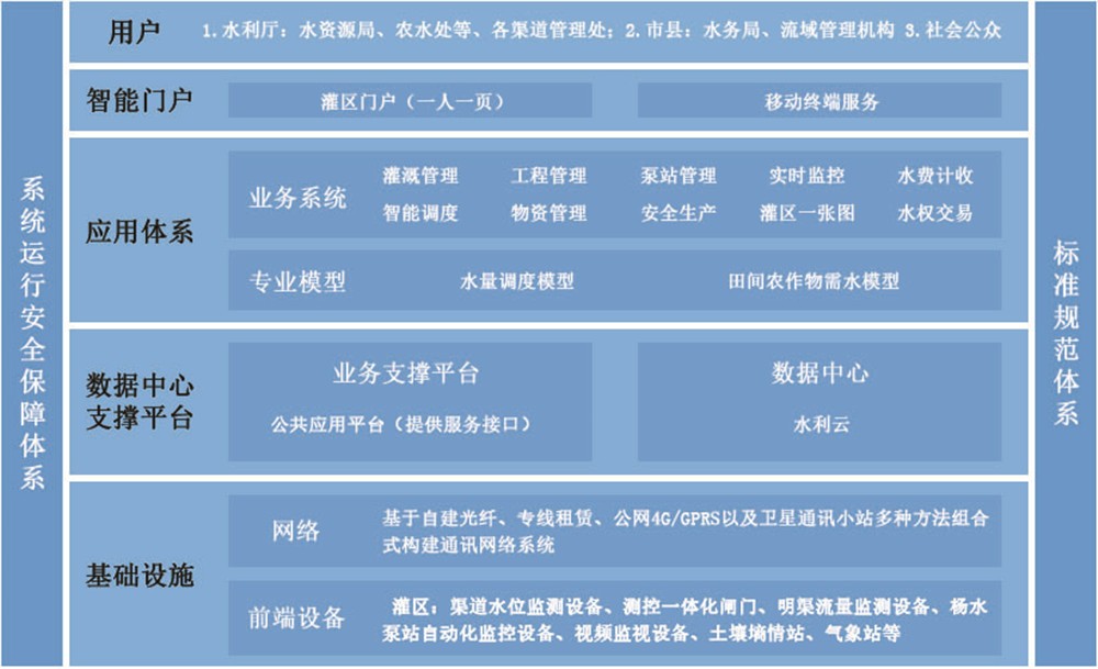 現(xiàn)代化灌區(qū)信息化體系基于已建的數(shù)據(jù)中心、業(yè)務(wù)平臺(tái)等智慧水利核心框架,開展現(xiàn)代化灌區(qū)信息化建設(shè),覆蓋數(shù)據(jù)采集、傳輸、存儲(chǔ)、應(yīng)用決策、灌區(qū)水利信息服務(wù)等各個(gè)環(huán)節(jié)。系統(tǒng)充分利用現(xiàn)代信息技術(shù),深入開發(fā)和廣泛利用灌區(qū)信息資源,大大提高信息采集和加工的準(zhǔn)確性以及傳輸?shù)臅r(shí)效性,做出及時(shí)、準(zhǔn)確的反饋和預(yù)測(cè),為灌區(qū)管理部門提供科學(xué)的決策依據(jù),全面提升灌區(qū)經(jīng)營(yíng)管理的效率和效能。