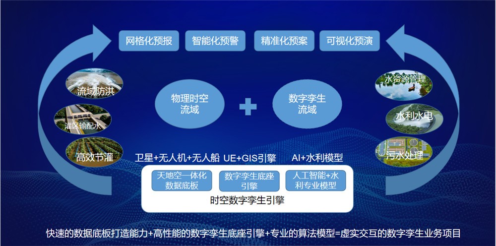 基于空天地一體化的數(shù)據(jù)底板、高效渲染、場景靈活配置的數(shù)字孿生底座引擎以及智能專業(yè)算法模型,生成虛實交互、協(xié)同映射的流域數(shù)字孿生工程,實現(xiàn)流域業(yè)務(wù)的網(wǎng)格化預(yù)報、智能化預(yù)警、精準化預(yù)案、可視化預(yù)演。